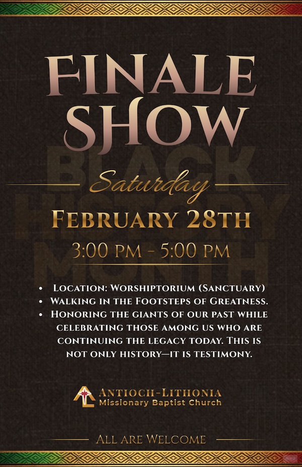 BHM – Finale Show + Add to Google Calendar + iCal / Outlook export 00 days 00 hours 00 minutes 00 seconds Date Feb 28 2026 Time 3:00 pm - 5:00 pm Location Antioch-Lithonia Missionary Baptist Church 2152 Rock Chapel Rd, Lithonia, GA 30058 Category Featured Main Share this event