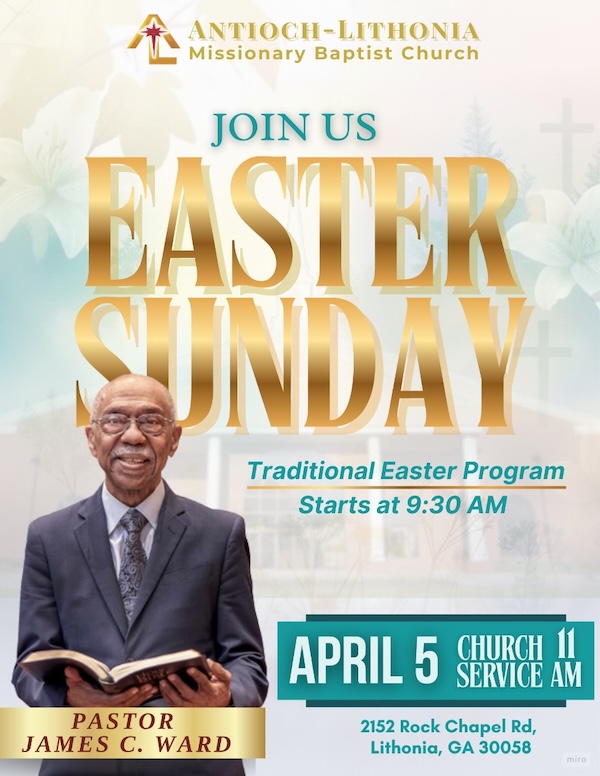 Easter 2026 + Add to Google Calendar + iCal / Outlook export 00 days 00 hours 00 minutes 00 seconds Date Apr 05 2026 Time 11:00 am Location Antioch-Lithonia Missionary Baptist Church 2152 Rock Chapel Rd, Lithonia, GA 30058 Category Featured Main Share this event